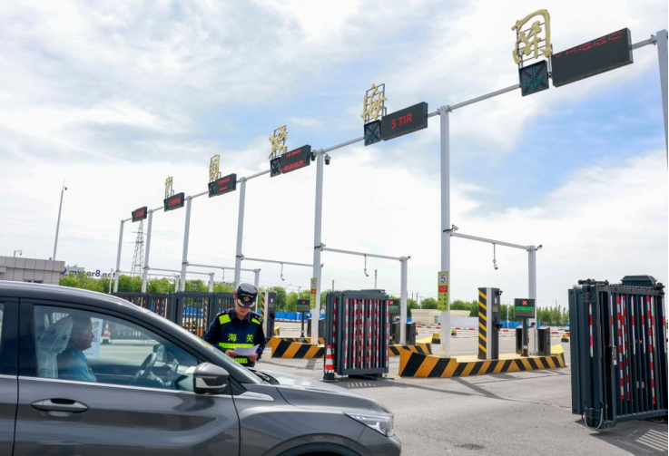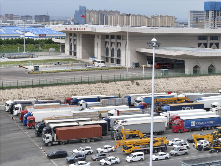 2025年5月27日在新疆霍尔果斯公路口岸拍摄的等待验放的车辆。新华社记者 王菲 摄