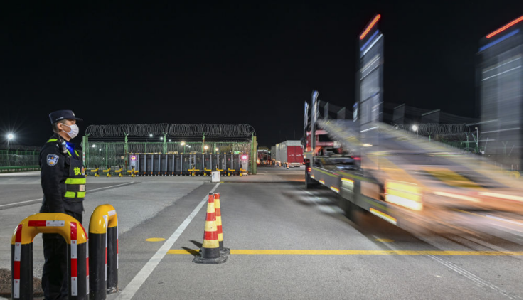 2024年4月19日0时许,在霍尔果斯公路口岸,一辆货车通过界桥出境。新华社记者 陈朔 摄