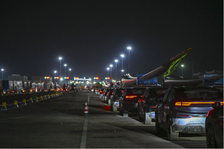 2025年6月11日凌晨3点的新疆霍尔果斯公路口岸,大量商品车排队等待出口。新华社记者 陈朔 摄