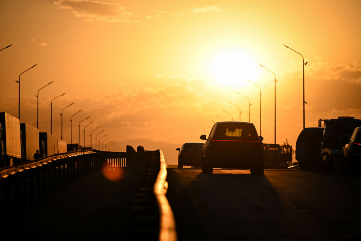 2025年5月22日,运输公司工作人员驾驶从中国进口的新能源汽车驶出哈萨克斯坦口岸,驶向哈萨克斯坦扎尔肯特镇的中转停车场。新华社记者 李任滋 摄