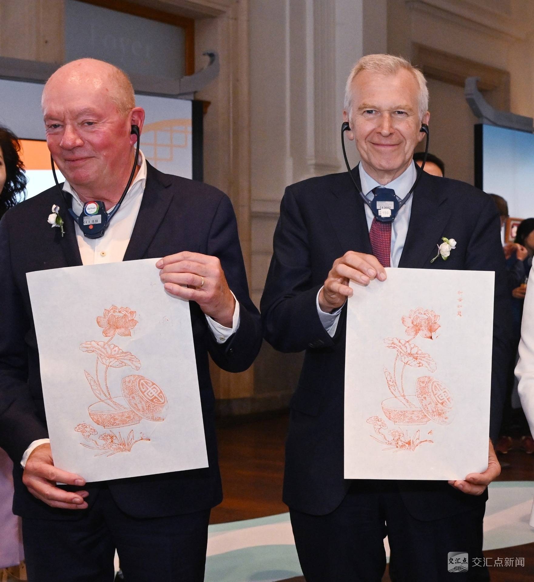非遗展区集结苏州刺绣、扬州雕版印刷、常州孟河医派、扬州剪纸、惠山泥人、宜兴紫砂等技艺精彩亮相,与观众互动。传承人现场飞针劈线、演示针灸推拿,让观众亲身感受“一根丝线劈300份”的精微匠心与中医智慧。在雕版印刷展示台前,伊夫·莱特姆前首相和扬·布里尔斯主席满怀热情参与互动,他们认真地刷墨、覆纸、轻刷,手持拓印好的“和合如意”作品,笑着合影打卡。