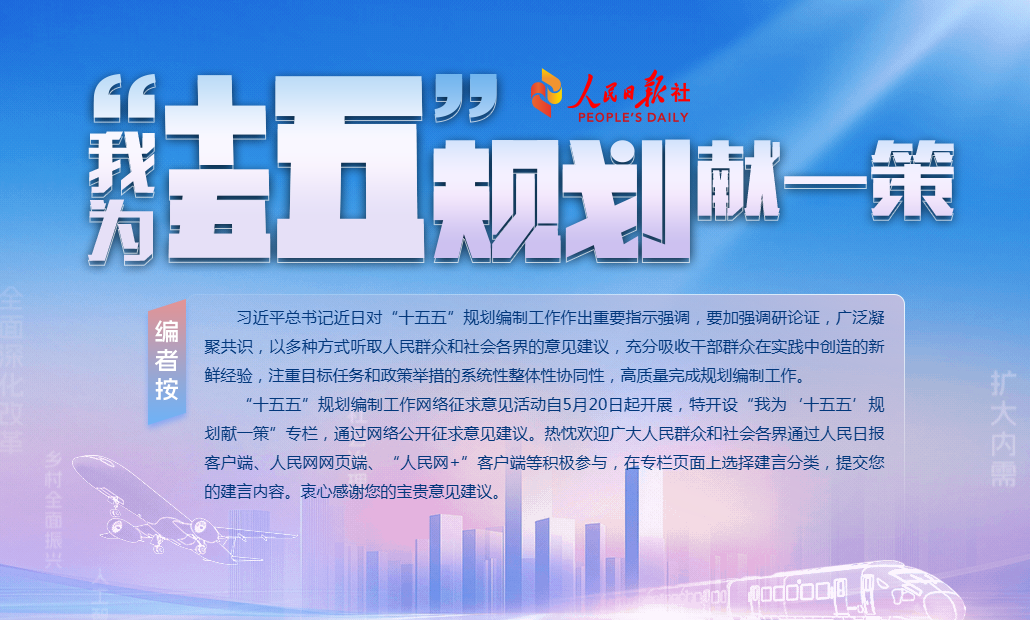“十五五”规划编制工作网络征求意见活动自5月20日起开展,特开设“我为‘十五五’规划献一策”专栏,通过网络公开征求意见建议。热忱欢迎广大人民群众和社会各界通过人民日报客户端、人民网网页端、“人民网+”客户端等积极参与,在专栏页面上选择建言分类,提交您的建言内容。衷心感谢您的宝贵意见建议。
