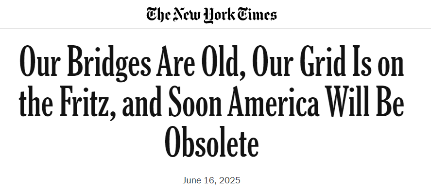 《纽约时报》6月16日刊发专栏文章称,美国的桥梁、电网和港口等基础设施正面临严重的老化与不足,美国即将被“老化淘汰”。