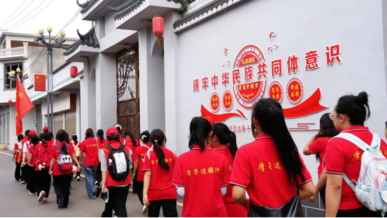 师生一行走进平远镇田心社区“民族团结幸福路”。这里曾因高墙林立,灰色砖墙割裂空间、阻断交流。随着“拆墙透绿”工程推进,取而代之的是绿意葱茏的庭院,这条路不仅贯通了社区脉络,更成为民族团结的精神纽带,见证着邻里间的交融。师生们了解到,田心社区在平远“三区”建设中,积极推动民族团结进步,通过居民主动让出土地参与社区改造等实际行动,展现了中华民族团结一心、共同发展的美好图景。