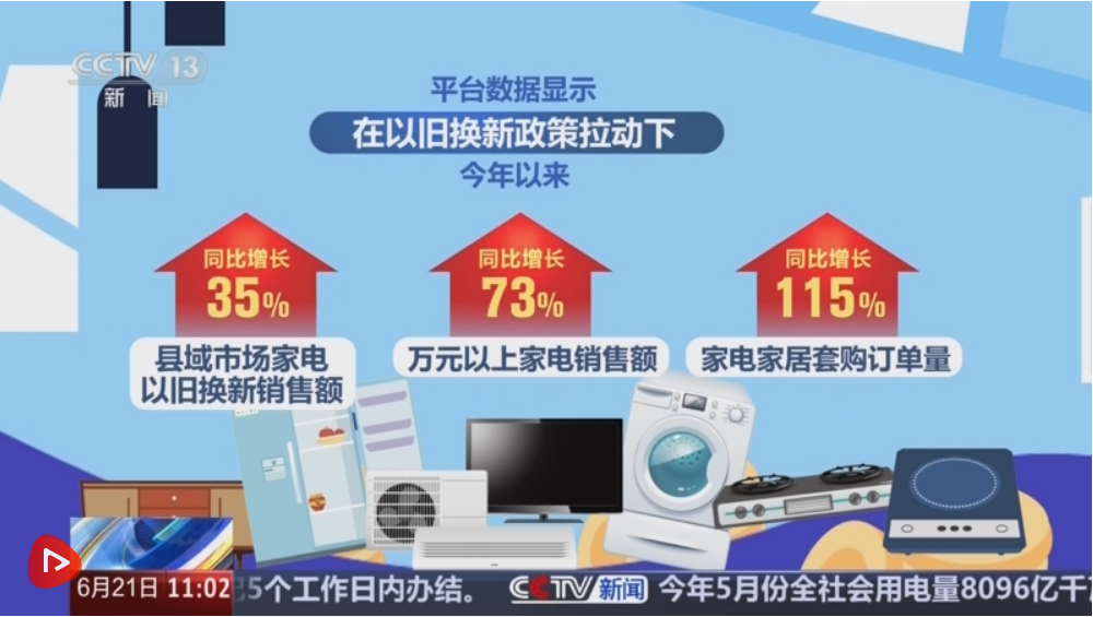 央视网消息:眼下,全国县域家电市场迎来了年中的销售高峰。平台数据显示,2025年6月1日至20日,县域市场家电总销量环比增长28%,“以旧换新”需求旺盛。