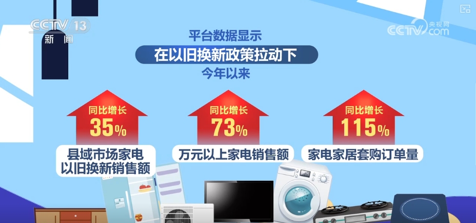 平台数据显示,在“以旧换新”政策拉动下,2025年以来,县域市场家电“以旧换新”销售额同比增长35%,万元以上家电销售额同比增长73%,家电家居套购订单量同比增长115%。