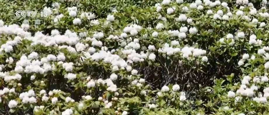 而到达山顶之后会看到另一番景象。漫山遍野的高山杜鹃迎风怒放,白色的花簇呈现出旺盛的生命力。这些花朵花期在两个月,初期盛开时与皑皑积雪相伴。
