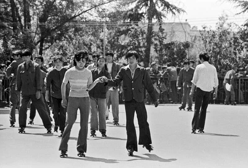 1981年,云南省昆明市翠湖公园,穿喇叭裤溜旱冰的时尚青年。刘建明/摄