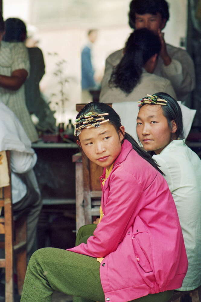 1985年,云南省南涧县城的一家理发室,两个进城烫发的农村女青年。刘建明/摄