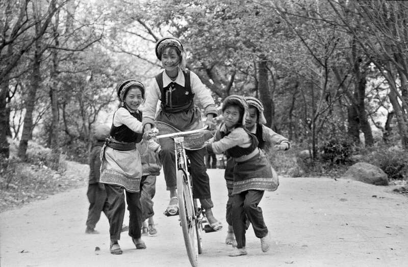1982年,云南省大理白族自治州喜洲镇,几位白族姑娘在学骑自行车。刘建明/摄