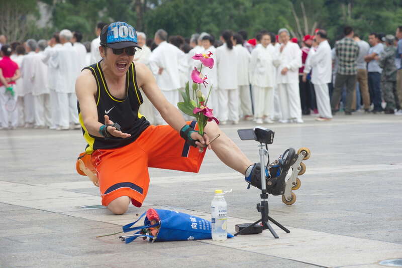 2014年,云南省昆明市碧鸡广场,一名脚蹬旱冰鞋、手执鲜花的青年正沉醉在自拍中。刘建明/摄