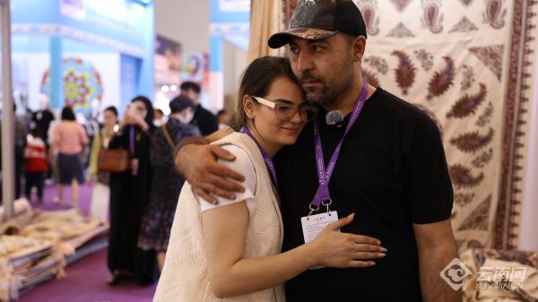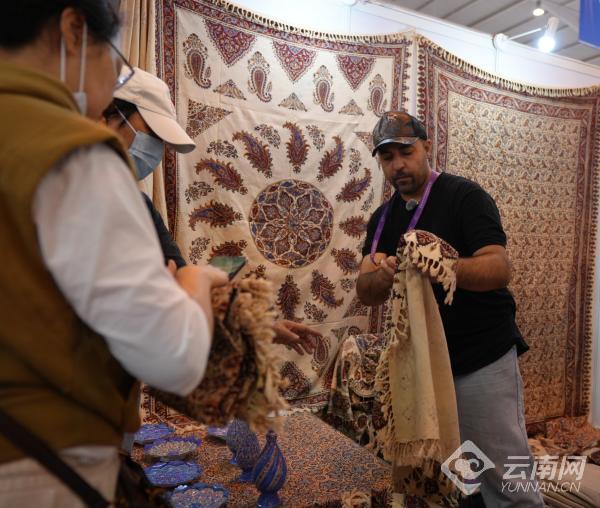 在5号馆,伊朗夫妇的摊位吸引着往来人群。五彩斑斓的手工织物与精致雕刻的铜盘错落有致地摆放着,灯光洒在这些承载着古老文明的工艺品上,仿佛将伊朗高原的神秘与瑰丽带到了云岭大地。