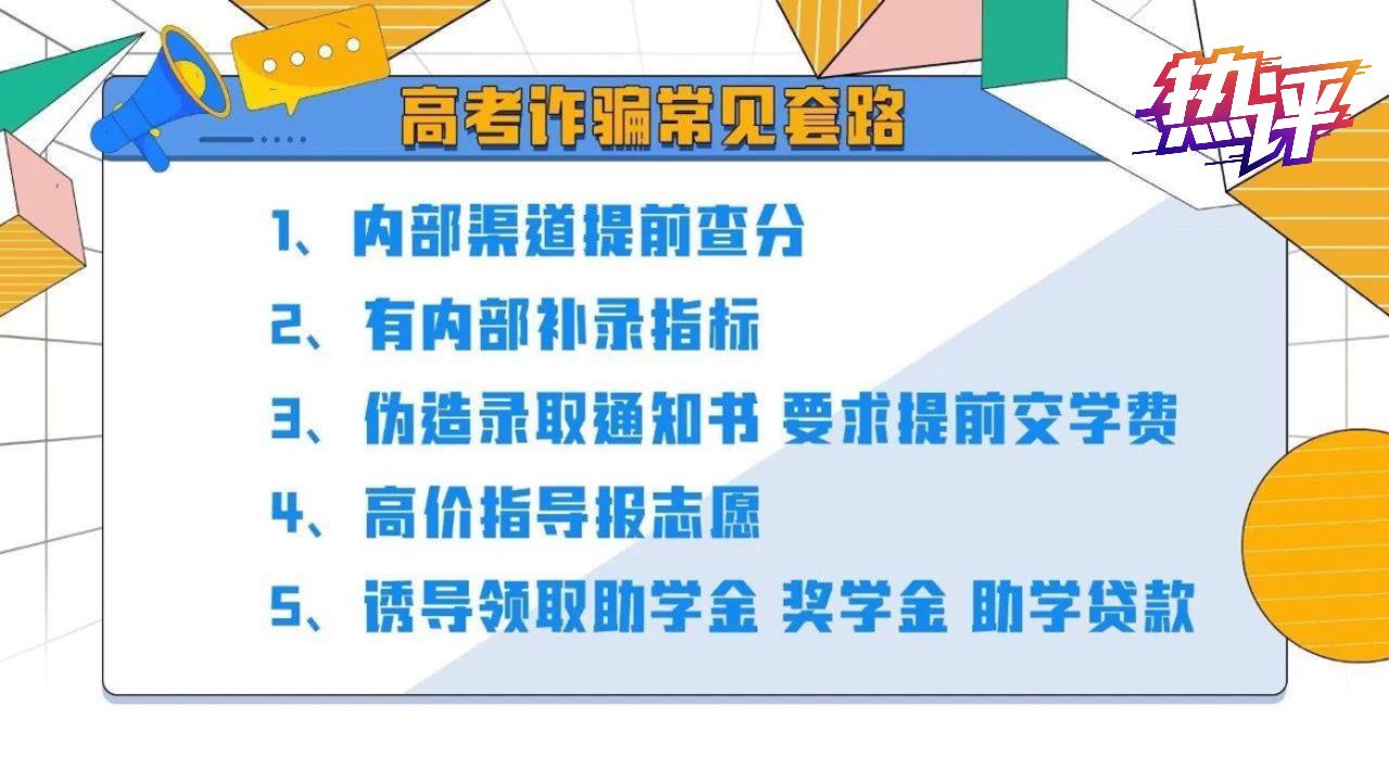 同时需要警惕的是,每年这个时候都会有部分不法分子利用考生和家长的急切心理设局行骗,常见的手段包括伪造虚假查分网站,谎称“内部渠道提前查分、改分”,以“名校培训”“预先录取”为诱饵或假借高考填报志愿咨询机构进行诈骗……广大考生和家长一定要注意防范。连日来,全国高校密集举办线上线下招生咨询会,为考生提供全方位政策解读与专业导航,如浙江高考志愿“云咨询周”、湖南“高考志愿公益大讲堂”等,请你做决策前一定要通过官方渠道获取准确信息。