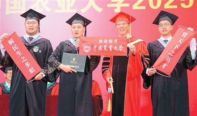 近日,中国农业大学2025年毕业典礼举行,校长孙其信为毕业生拨穗并与学生合影留念。