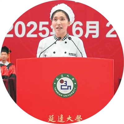 6月20日,延边大学2025届学生毕业典礼邀请学校的食堂阿姨刘晓梅进行致辞。