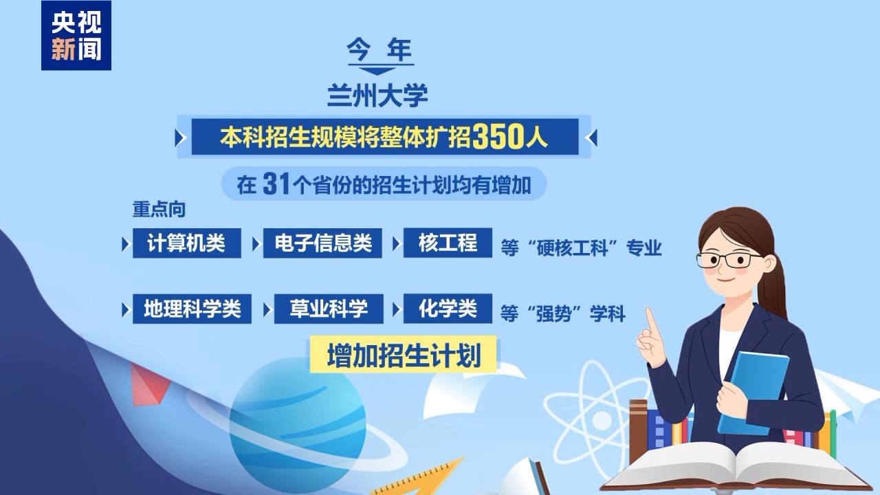 今年,优质本科高校招生计划进一步扩大,各高校继续推进学科专业优化调整,一批专业“上新”,一批专业“停招”,匹配人才供需。以兰州大学为例,本科招生规模将整体扩招350人,在31个省份的招生计划均有增加,重点向计算机类、电子信息类、核工程等“硬核工科”专业,以及地理科学类、草业科学、化学类等“强势”学科增加招生计划。