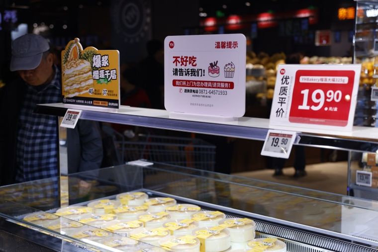 走进调改后的卖场,现烤面包的香气便萦绕鼻尖。透明操作间内,师傅正将面包坯送进烤箱,一旁的明星产品“丰收的喜悦之菌菇多多”堆成小山,肉眼可见的真实菌菇粒与马苏里拉干酪粉交融,咸香扑鼻;榴莲千层、瑞士卷等经典甜点旁,更陈列着与胖东来同款的DL芋泥雪贝、焦糖可颂蛋挞,烘焙区以“不隔夜”的健康标签,成为昆明家庭下午茶的新选择。
