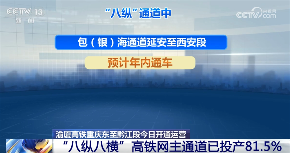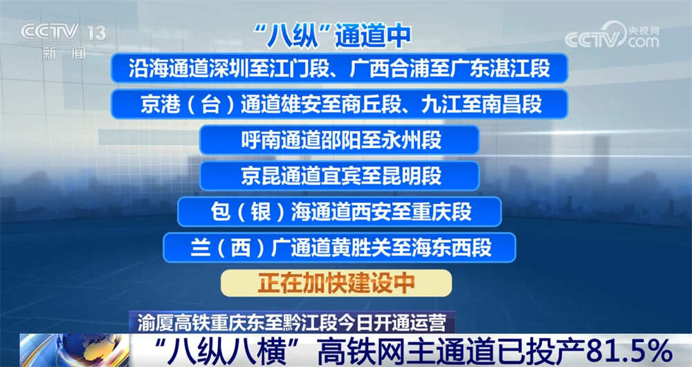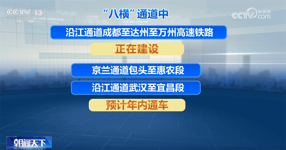 “八纵”通道中沿海通道深圳至江门段、广西合浦至广东湛江段、京港(台)通道雄安至商丘段、九江至南昌段、呼南通道邵阳至永州段、京昆通道宜宾至昆明段、包(银)海通道西安至重庆段、兰(西)广通道黄胜关至海东西段正在加快建设中,包(银)海通道延安至西安段预计年内通车。“八横” 通道中沿江通道成都至达州至万州高速铁路正在建设,京兰通道包头至惠农段、沿江通道武汉至宜昌段预计年内通车。