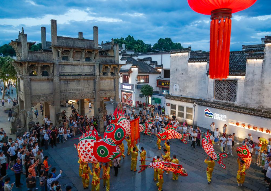 People watch a fish lantern performance in the Huizhou ancient town of Shexian County, east China's Anhui Province, June 12, 2025. (Photo by Shi Yalei/Xinhua)
