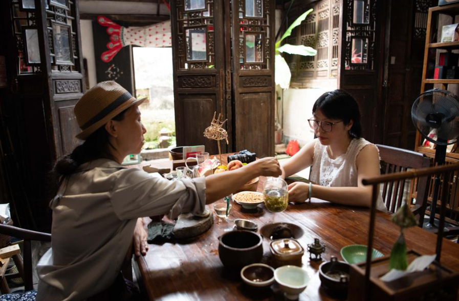 Tourists drink tea at a tearoom in the Huizhou ancient town of Shexian County, east China's Anhui Province, June 20, 2025. (Xinhua/Zhang Duan)
