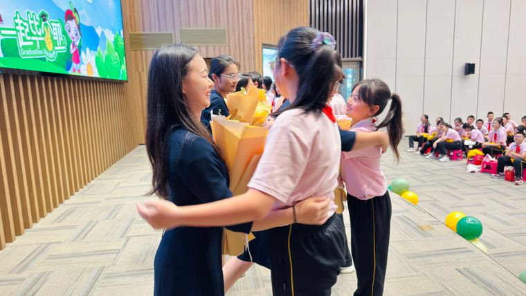 “老师,谢谢您!”谢师环节,2025届毕业生向教师们致以崇高的敬礼,深深的感恩之情在无声的礼仪中传递。随后,学生们为老师们献上鲜花,向六年来默默耕耘的老师们致以崇高的敬意与诚挚的感谢。老师们紧紧拥抱孩子们,千言万语化作一句句叮嘱与祝福,不少师生潸然泪下。现场播放的视频中闪过六载春秋的点点滴滴,六年时光以光影为笔,课堂上的思维碰撞、运动会上的冲刺瞬间,大课间的欢声笑语,每一帧都是时光的馈赠。