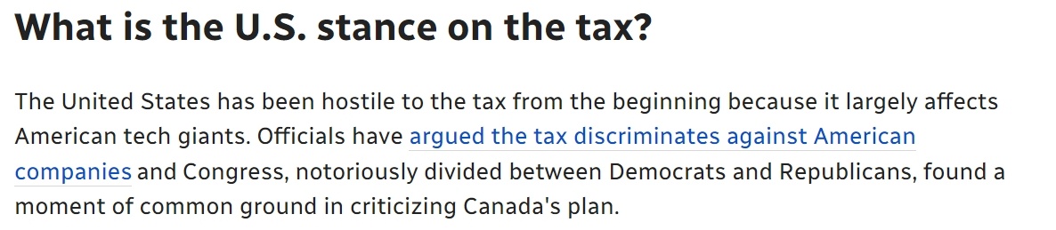 据媒体分析,美国从一开始就对加拿大的数字服务税抱有敌意,因为它在很大程度上触碰了美国科技巨头的利益。