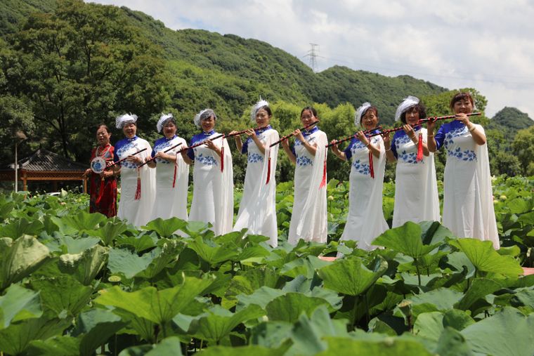 时装走秀环节更是活动的一大亮点。演员们身着精美服饰,手持笛子、竹箫等乐器从荷花池畔依次缓缓走来,将时尚与自然完美融合。