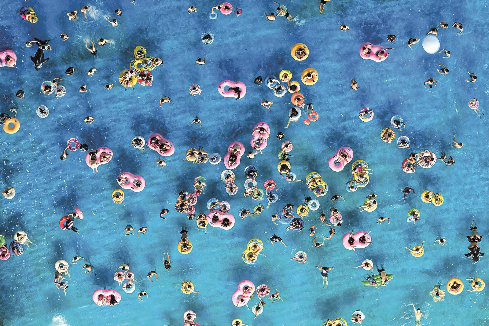 连日来,全国多地高温天气持续,水上娱乐项目热度持续攀升。涉水旅游景区、水上乐园等场所纷纷推出优惠措施,点燃市民游客夏日消费热情。图为6月28日游客在江苏省南京市江宁区汤山欢乐水世界戏水游玩,尽享夏日清凉。(视觉中国 供图)