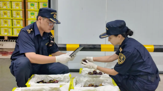 勐腊海关关员在磨憨铁路口岸对进口山竹进行查验