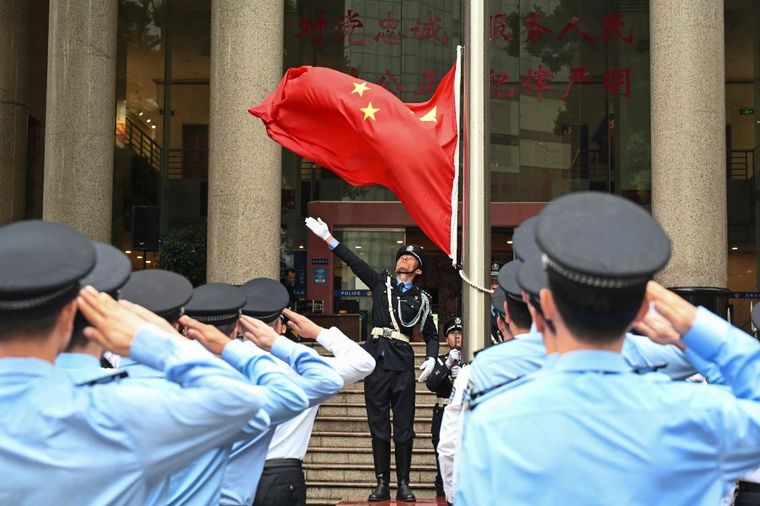上午8时,升旗仪式开始,全体人员整装列阵、警容严整、精神抖擞,护旗方队迈着铿锵的步伐走向升旗台。在雄壮激昂的国歌声中,鲜艳的五星红旗冉冉升起,全体党员民警辅警代表怀着无比崇敬的心情向国旗庄严敬礼。