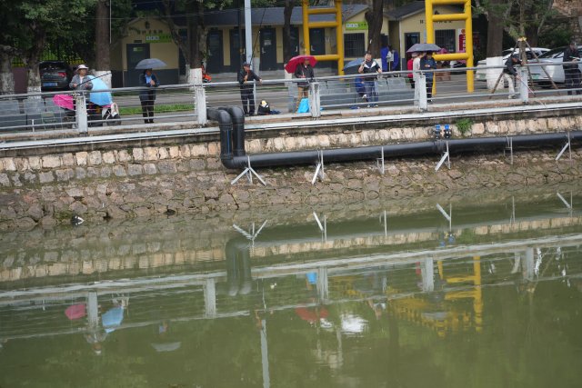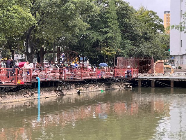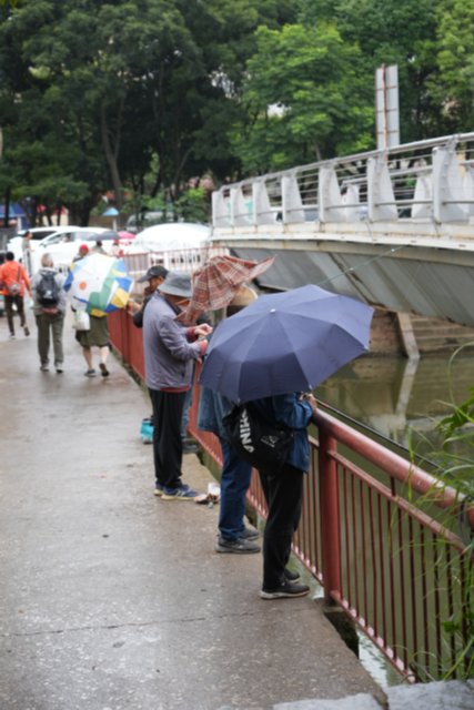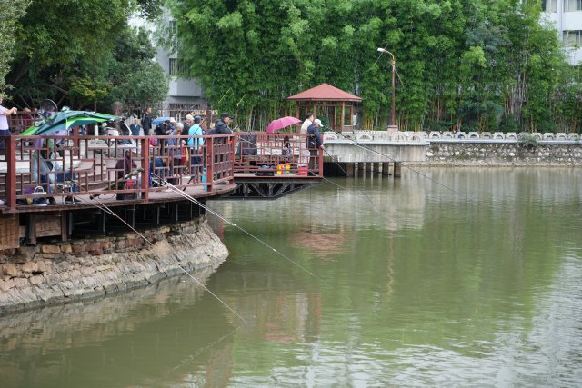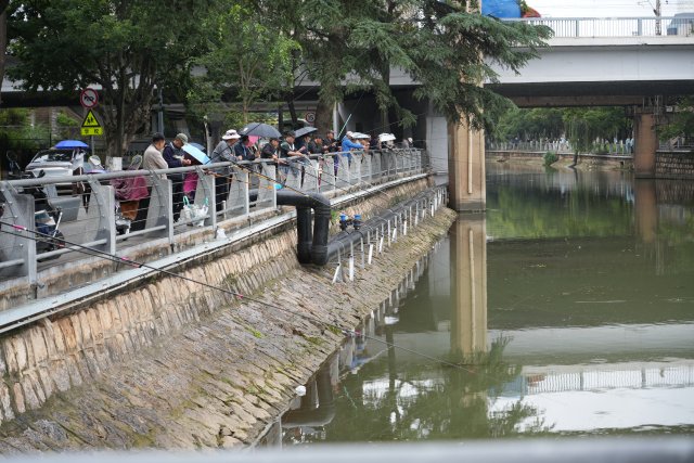 从环城西路往大观河闸口方向走,记者遇见不少垂钓爱好者,他们有的裹着雨衣,像一尊尊沉默的雕塑,目光紧紧锁定浮漂;有的撑着雨伞,或站或坐;还有人将鱼饵抛出后,和一旁的钓友聊了起来。