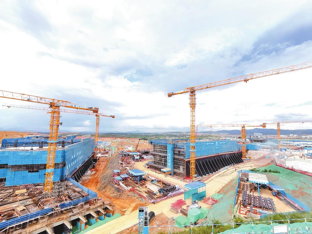 当天,昆明长水国际机场改扩建工程T2航站楼项目建设工地上塔吊、桩机运转如常,机械轰鸣、工人忙碌,一派热火朝天的建设场景。