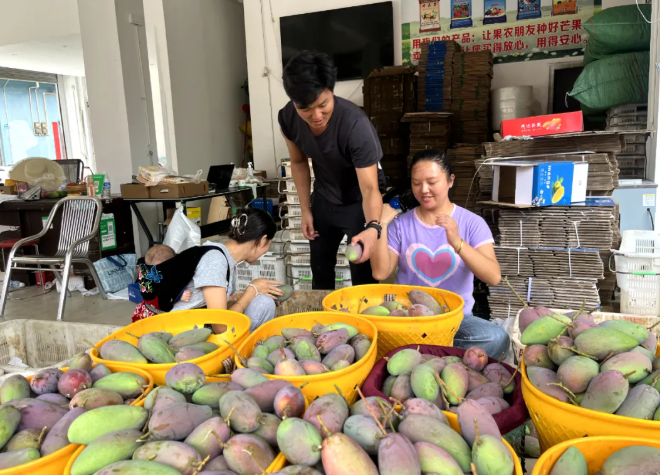在芒果收购点,一筐筐颜色鲜艳、不同品种的芒果整齐摆放,工作人员忙着分拣、打包、装箱,流水线工作一气呵成。