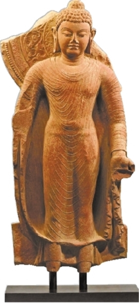 对于犍陀罗风格,我们比较熟悉,而秣菟罗风格有哪些特征呢?公元1世纪,恒河支流朱木拿河西岸的秣菟罗,兴起了以印度本土艺术传统为基础,以佛教为主要内容的秣菟罗艺术。秣菟罗风格是印度的本土风格,贵霜时期其造像特点是肉髻小而高,发髻多是素面,磨光肉髻。佛像面相丰圆,眉细眼大,鼻梁高挺,嘴小唇薄。公元3—5世纪笈多时期,出现修长秀美、圆润柔和的佛像。造像比例均匀,身着圆领通肩式的薄衣,衣领为大圆弧形,有多道皱褶,衣纹呈“U”字或“V”字形的平行衣纹,线条平滑流畅,给人以薄衣贴身的韵律感。因佛衣质地薄透、贴体,如“曹衣出水”极富装饰性,躯体起伏变化显著。