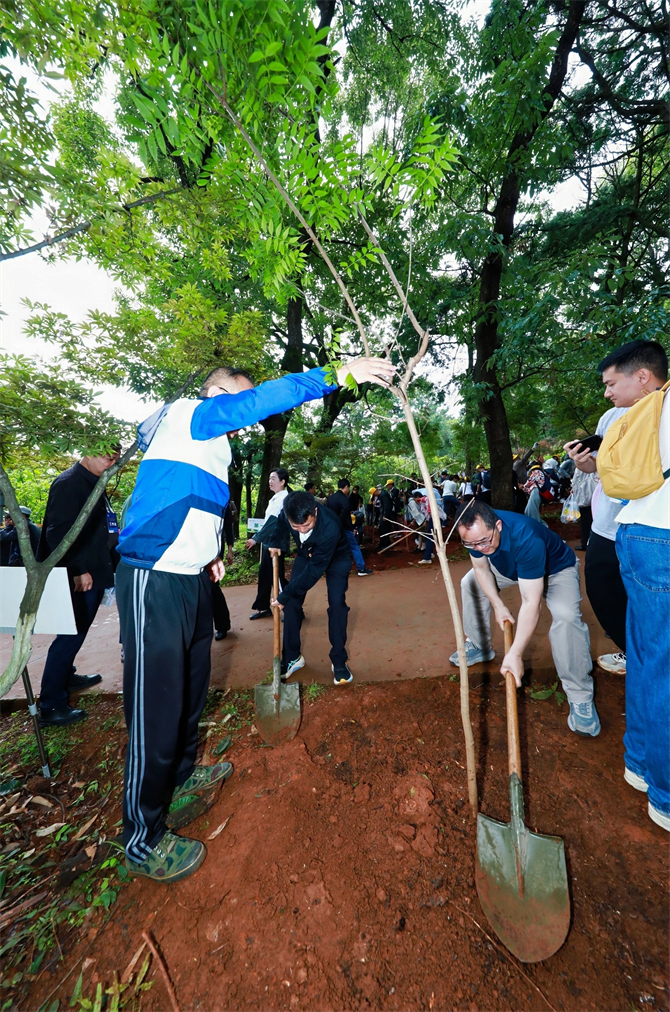 随后,博士们有序前往植树区域,在工作人员和志愿者的引导下,共同种下150余株黄连木。一位清华博士说:“很开心能参加植树劳动,我们种下的不只是一棵树,也是对绿美云南的美好期待。”