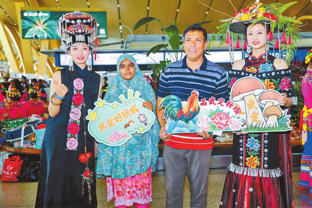 7月5日,武定县在昆明长水国际机场与南屏街双核联动,举办壮鸡野生菌美食季暨彝族火把节预热活动。甫抵机场的各国旅客瞬间被绚丽的非遗展演和彝族歌舞吸引,争相与身着民族服饰的工作人员拍照留念,沉浸式体验“有一种叫云南的生活”。(云南日报 记者吴沛钊/摄)