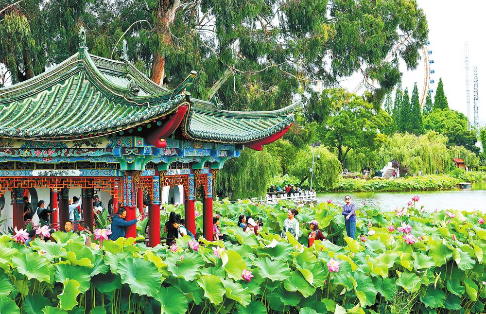 近日,昆明大观公园荷花绽放,鲜艳的荷花与绿瓦红柱的亭台楼阁相映成趣,前来赏花的市民游客纷纷用手机、相机记录下这属于夏天的浪漫。(云南日报 记者 黄兴能 摄)