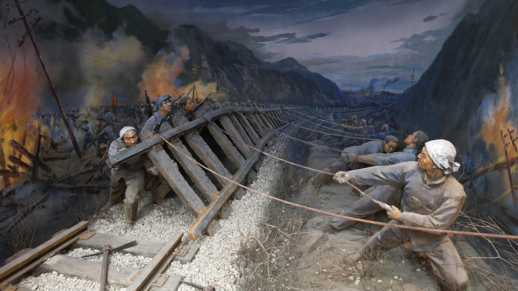 △百团大战纪念馆内展示的军民掀翻铁轨的场景。(总台央视记者范凯、裴大伟拍摄)