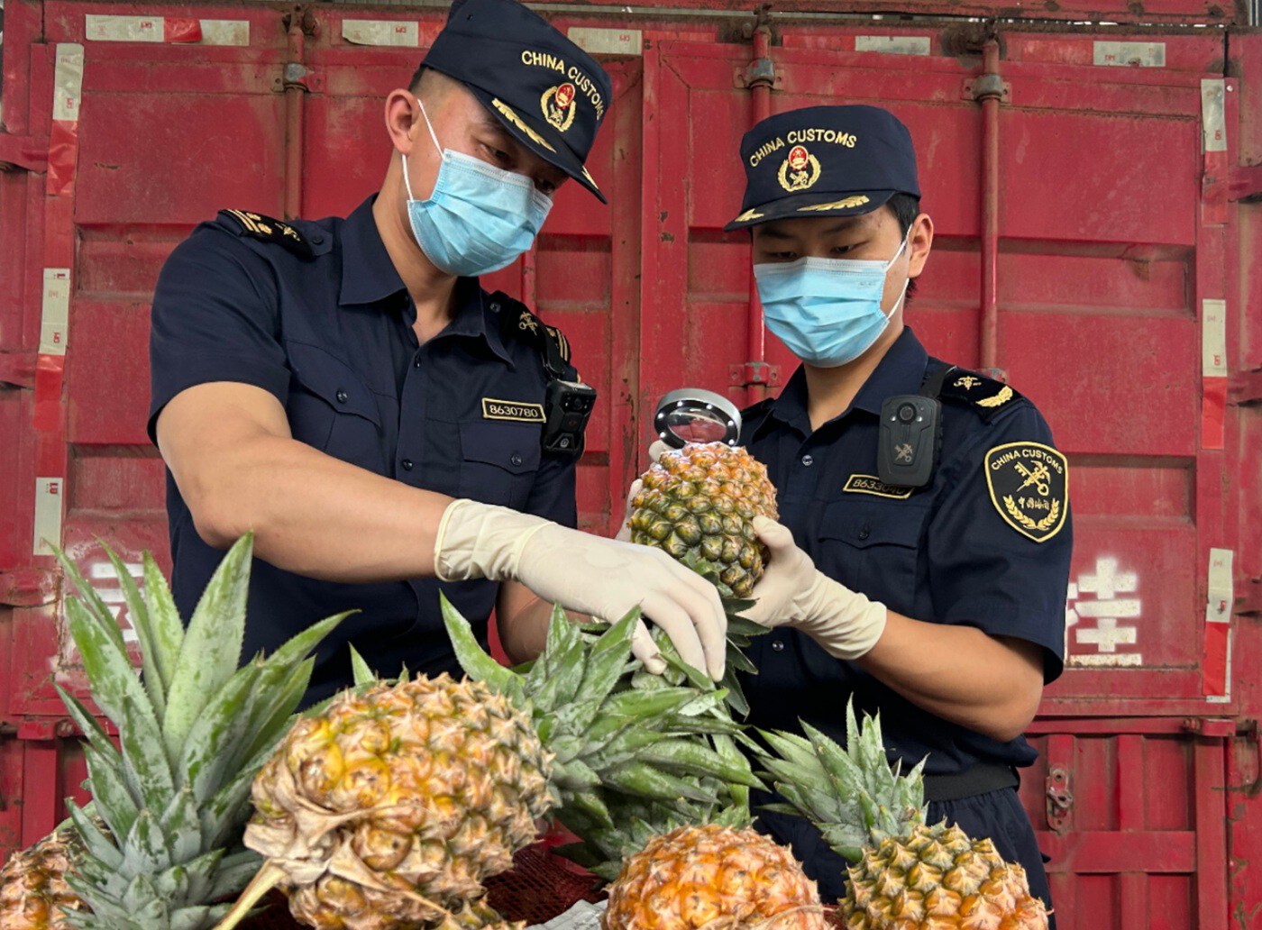 海关关员在畹町口岸对缅甸鲜食菠萝开展现场查验 通讯员 段吴梦雪 摄