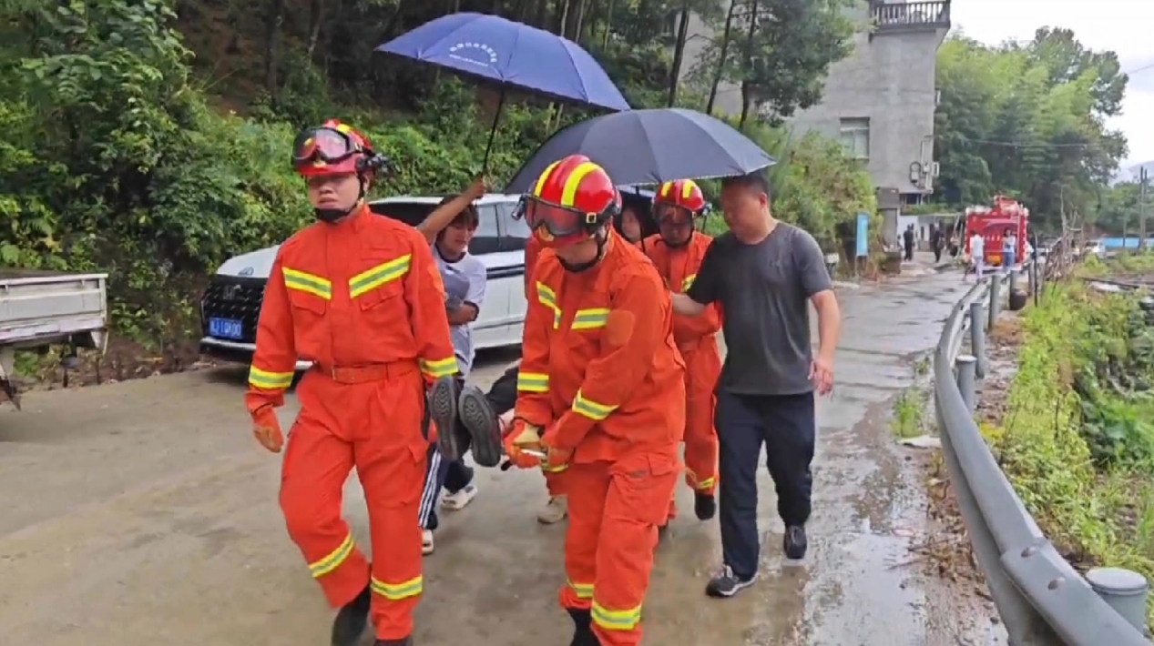 在台州黄岩屿头乡,转移小组在排查中发现上凤村一处地质灾害隐患点居住着一位92岁老人,大家立即取来担架将老人慢慢抬出。在大家冒雨接力下,老人被护送至安置点。