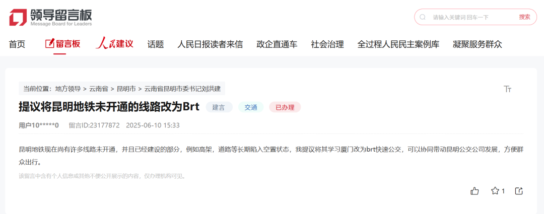 我提议昆明学习厦门做法,把尚未开通的线路改为BRT(快速公交系统),这既可以带动昆明公交发展,又方便群众出行。