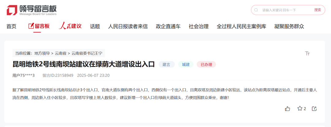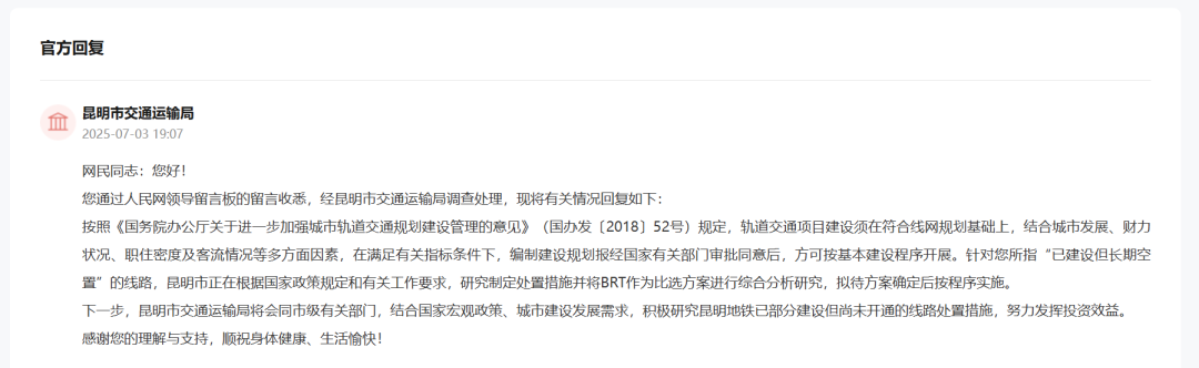 对于网友在人民网地方留言板上的“提议将昆明地铁未开通的线路改为BRT”及“昆明地铁2号线二期南坝站建议在绿荫大道增设出入口”留言,昆明市有关部门近日分别进行了回复。