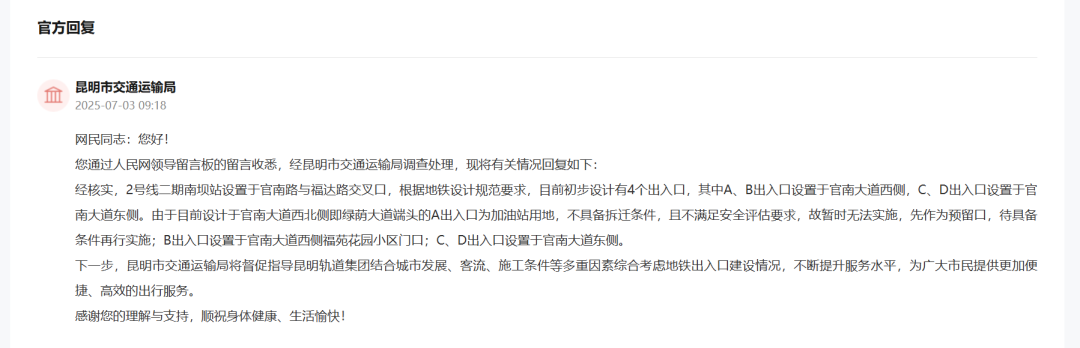 下一步,昆明市交通运输局将督促指导昆明轨道集团结合城市发展、客流、施工条件等多重因素综合考虑地铁出入口建设情况,不断提升服务水平,为广大市民提供更加便捷、高效的出行服务。