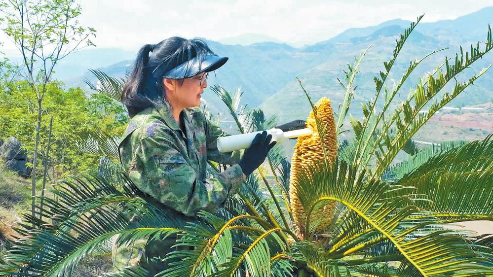 工作人员采集红河苏铁雄花花粉。