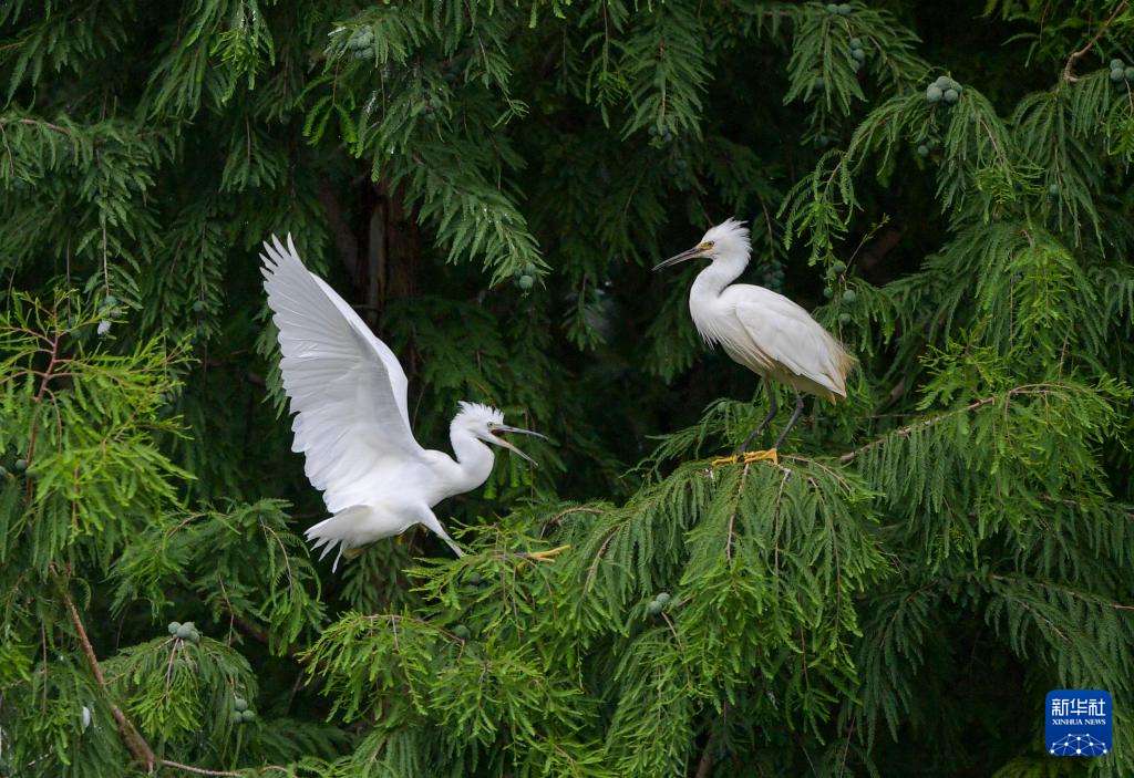 7月7日,两只白鹭在昆明滇池海洪湿地公园嬉戏。新华社记者 陈欣波 摄