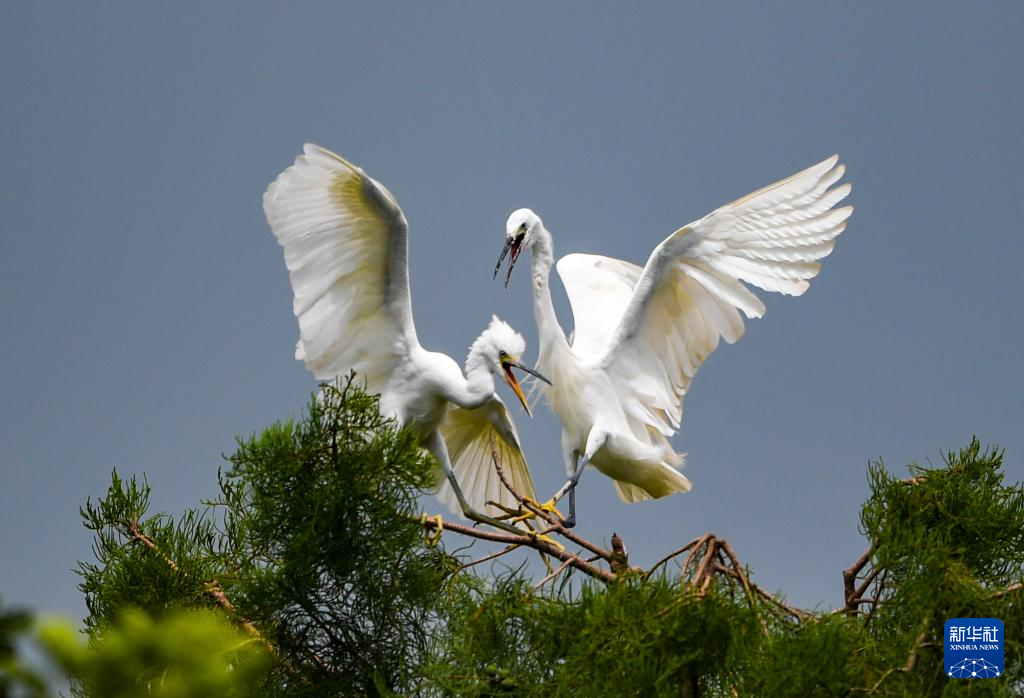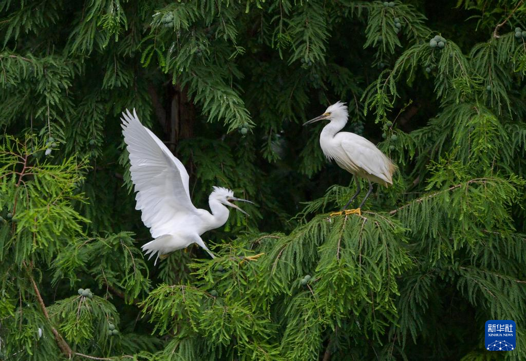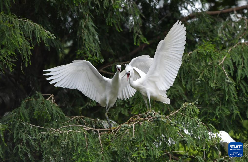 7月7日,两只白鹭在昆明滇池海洪湿地公园嬉戏。新华社记者 陈欣波 摄