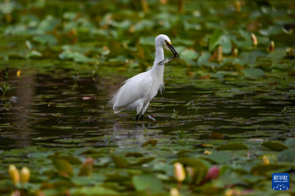 7月7日,一只白鹭在昆明滇池海洪湿地公园内捕食。新华社记者 陈欣波 摄