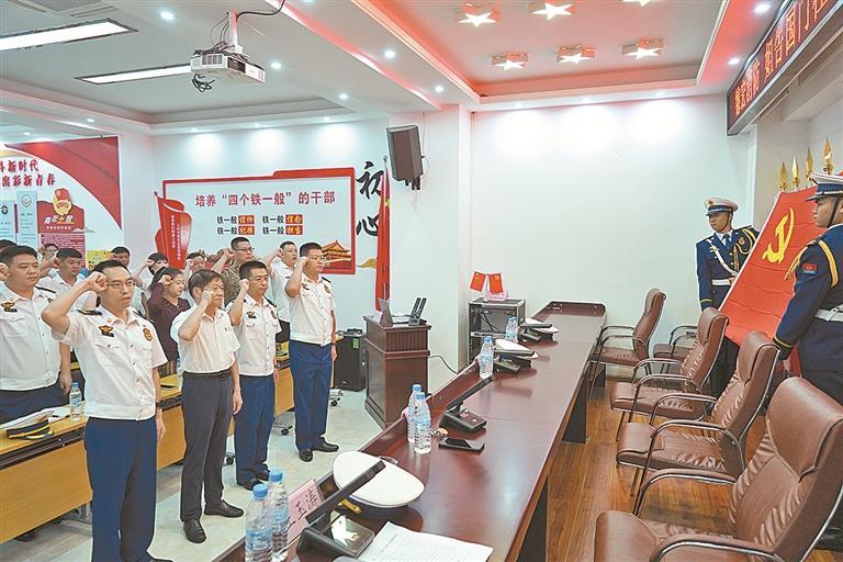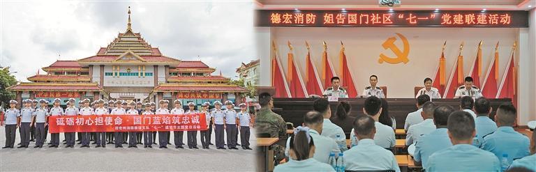 国门联建:凝聚守护合力,共筑平安边境。7月1日上午,一场意义特殊的党建联建活动在瑞丽市姐告国门开展。支队党委班子、消防指战员代表与姐告国门社区党委成员齐聚口岸,共同回顾党的光辉历程。在雄壮的国歌声后,全体人员在支队政委李斌领誓下,面向党旗重温入党誓词,忠诚信念在祖国边陲激荡回响。姐告国门社区党委书记康文韬以“姐告发展的昨天今天明天”为题,生动讲述了党领导下边疆地区的沧桑巨变,深化了指战员“治国必治边”的责任认同。随后,消防骨干结合口岸特性,为社区网格员讲授消防巡查、隐患处置等实务技能,推动“消防+网格”深度融合,筑牢边境社区“防火墙”。