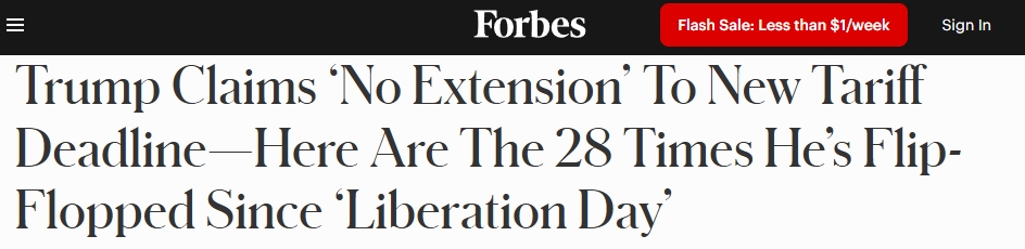 对于此次关税调整,《福布斯》杂志网站7日报道指出,从今年2月7日首次公开提及对他国进口商品征收全面关税,到强调“2025年8月1日这一日期不会有任何延长”的这五个月里,特朗普政府在关税问题上的态度“翻转”了大约28次。