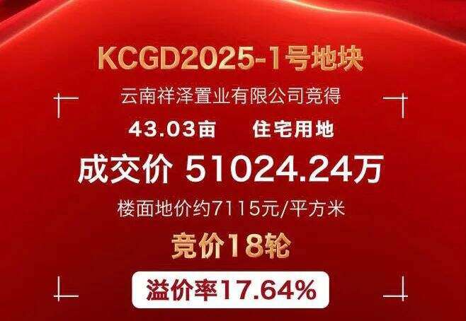 7月9日,位于官渡区世纪城旁的KCGD2025-1号地块成功出让,本次土地拍卖起拍价为43374.24万元,经18轮竞价后,由云南建投旗下子公司云南祥泽置业有限公司以约5.1亿元竞得,成交楼面地价约7115元/平方米,溢价率17.64%,成为近期昆明土拍市场又一高热度地块。